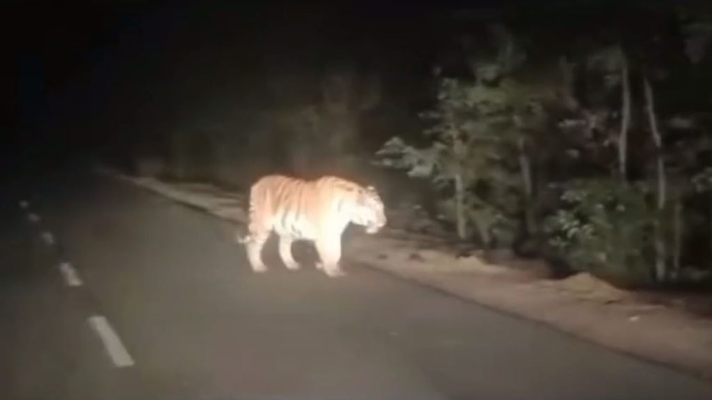 नाइट सफारी से लौट रहे पर्यटकों को सड़क पर दिखा बाघ