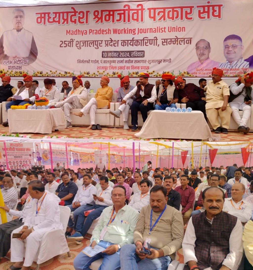 शाजापुर। मध्यप्रदेश श्रमजीवी पत्रकार संघ की 25 वीं प्रदेश कार्यसमिति की बैठक एवं सम्मेलन रविवार को शाजापुर जिले के शुजालपुर में प्रदेश अध्यक्ष शलभ भदौरिया की अध्यक्षता में सम्पन्न हुई। मुख्य अतिथि के रूप में प्रदेश के उच्च शिक्षा मंत्री इन्दर सिंह परमार मौजूद थे जबकि शाजापुर विधायक अरुण भिमावत, भाजपा जिला अध्यक्ष अशोक नायक, जिला पंचायत अध्यक्ष हेमराज सिंह विशिष्ट अतिथि थे।