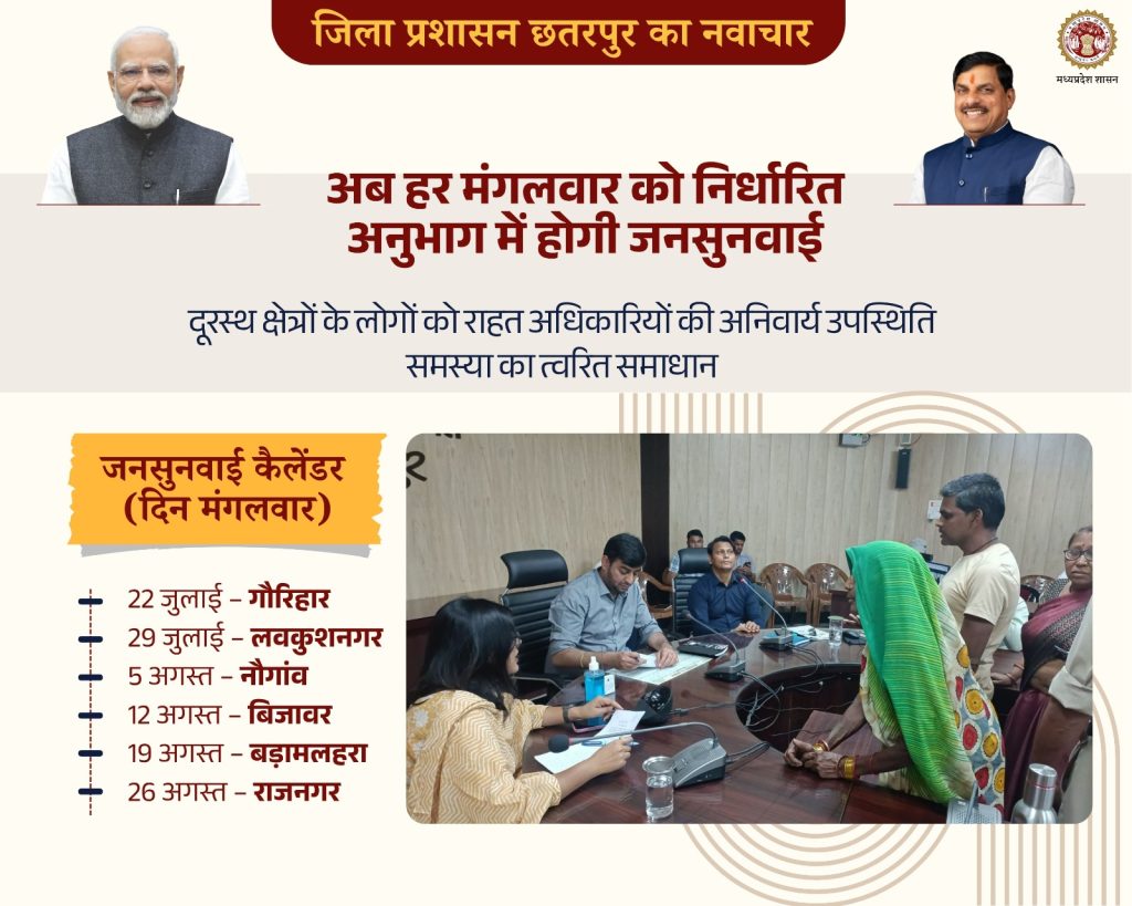 22 जुलाई 2025 मंगलवार को गौरिहार में, 29 जुलाई को लवकुशनगर में, 05 अगस्त को नौगांव में, 12 अगस्त को बिजावर में, 19 अगस्त को बड़ामलहरा में एवं 26 अगस्त 2025 को राजनगर में जनसुनवाई का आयोजन अनुविभाग एसडीएम कार्यालय में किया जाएगा।